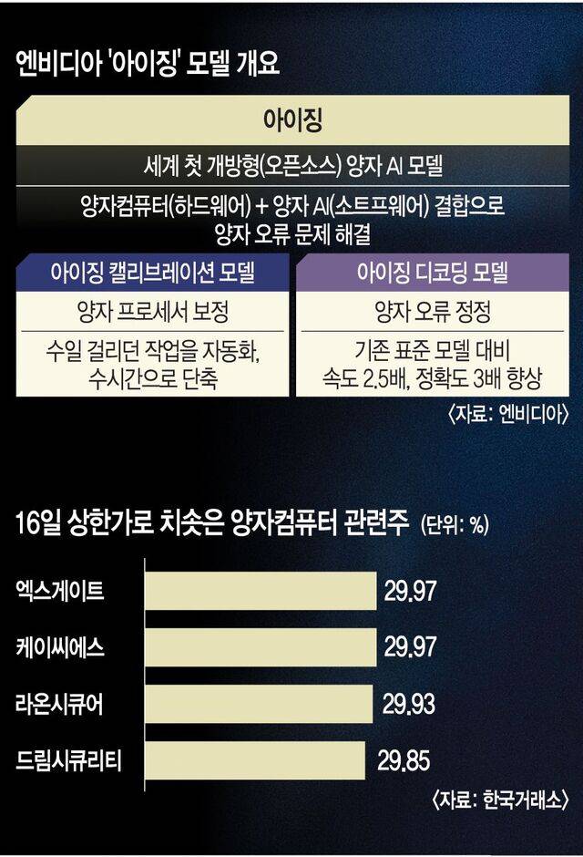엔비디아가 양자컴퓨팅 상용화를 앞당길 세계 최초의 개방형(오픈소스) 양자 인공지능(AI) 모델 ‘아이징’을 공개했다. 그간 양자컴퓨터는 압도적인 연산 성능에도 불구하고 불안정성과 오류 문제로 상용화가 지연돼 온 ‘미완의 영역’이었다. 엔비디아는 이 난제를 그래픽처리장치(GPU) 기반의 AI 소프트웨어로 해결하는 기술을 전면 개방하며 ‘하이브리드 양자컴퓨팅’ 생태계 표준을 선점하겠다는 공격적 전략에 나섰다.