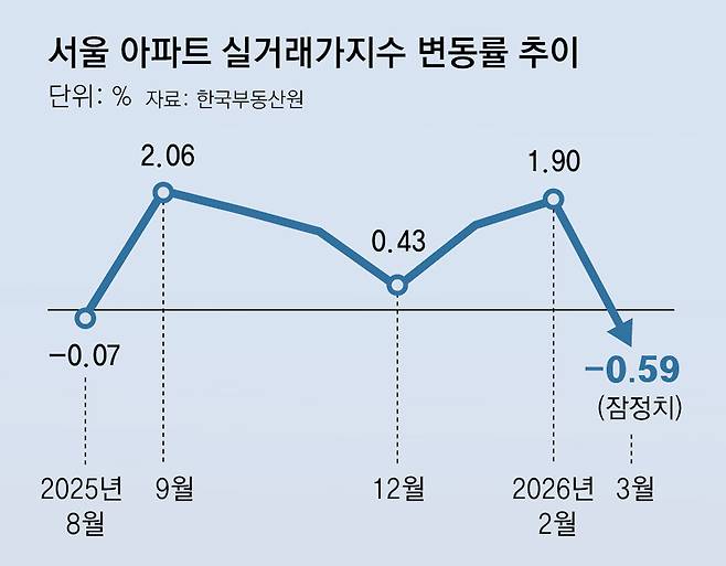 16일 한국부동산원 전국 공동주택 실거래가지수에 따르면 3월에 계약된 서울 아파트 실거래가지수 잠정치는 전월 대비 0.59% 하락하는 것으로 나타났다.