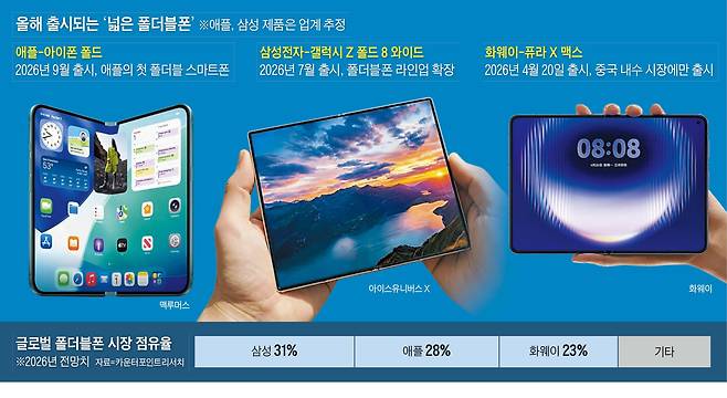 폴더블폰 1위인 삼성도 대응에 나선다. 삼성전자는 오는 7월 영국 런던에서 열리는 갤럭시 언팩 행사에서 갤럭시 Z 폴드·플립 8과 함께 첫 와이드 폴더블폰을 공개할 것으로 알려졌다. 이 역시 기존 폴드 시리즈와 다르게 세로는 줄이고 가로는 늘린 4:3 비율이 될 전망이다. 애플의 진입으로 재편될 폴더블 시장 주도권을 지키기 위한 선제 포석으로 해석된다.