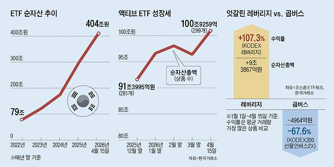 16일 한국거래소에 따르면 국내 ETF 순자산 총액은 전날 종가 기준 404조원을 돌파했다. 같은 날 액티브 ETF 순자산 총액도 100조원을 넘어서며 성장세를 뒷받침했다. 액티브 ETF는 지수를 단순 추종하는 패시브 상품과 달리 운용사가 종목과 투자 비율을 직접 결정해 초과 수익을 추구하는 상품이다. ETF 시장에 막대한 자금이 몰리면서 시장 내 옥석 가리기가 본격화하고 있다.