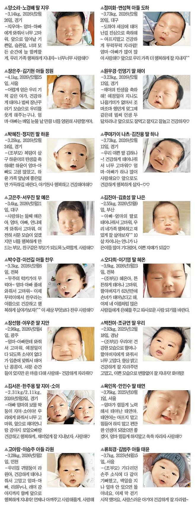 온 가족에게 기쁨을 안겨 준 아기의 탄생을 알려주세요. 홈페이지 주소 입력창에 아가야안녕.com이라고 입력하면 됩니다. 매일유업 육아 정보 사이트 매일아이(maeili.com)를 통해서도 접속할 수 있습니다. 추첨을 통해 출산 소식과 사진이 지면에 실린 가족에게는 ①케이크 구매권 ②엄마와 아이를 위한 매일두 포인트 3만원 ③출산 소식을 생일 날짜 본지 1면에 담은 PDF 파일 ④조선일보 1개월 무료 구독권을 드립니다. 당첨자 중 한 가족을 선정하여 해당 지면을 고급 프레임에 담아 제공하는 조선일보 리프린트도 제작해 드립니다. 홈페이지에서는 균형 영양식 메디웰 2만원 할인 혜택도 드리고 있습니다.