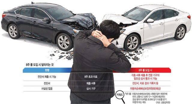 교통사고 손해보험 보상 체계를 바꾸는 ‘8주 룰’ 도입이 눈앞으로 다가왔다. 상해 12~14급에 해당하는 교통사고 경상 환자가 8주를 넘겨 장기 치료받기 어렵게 하는 내용이라 이런 별칭이 붙었다. 금융 당국과 손보업계는 자동차손해배상보장법 시행령 일부 개정이 과잉 진료로 인한 자동차보험금 누수를 막아 전체 금융 소비자의 보험료 인하를 이끌 것이라고 본다. 반면 대한한의사협회를 주축으로 한 의료계와 일부 시민단체는 환자 진료권이 침해되고 보험업계 배만 불릴 것이라며 8주 룰 도입을 무기한 연기해야 한다고 주장한다.