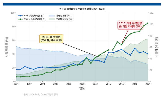 1970년대까지만 해도 브라질 세하도(Cerrado) 고원은 산성 토양의 불모지로 여겨졌다. 대두의 원산지는 온대이기 때문에 브라질 농업연구공사(Embrapa)가 1970년대부터 석회 처리와 열대 적응 품종 개량에 착수해 이 땅을 옥토로 바꾸는 데 20년이 걸렸다. 지금 보는 숫자들은 그 결과다.브라질은 대두뿐 아니라 옥수수에서도 미국을 압박하고 있다. 브라질의 두 번째 작물, 이른바 ‘Safrinha(2기작)옥수수’는 대두 수확 직후 같은 밭에서 재배한다. 2012년 미국 콘 벨트(Corn Belt)가 가뭄으로 말라미국산 옥수수가 역대 최고가($8.49/bu)를 기록했을 때, 브라질 농가들은 Safrinha 면적을 대폭 늘렸다. 그 결과 브라질 옥수수 수출은 2010년대 초 연 1,000~1,500만 톤 수준에서 2023년 5,000만 톤으로 3배 이상 급증했다.