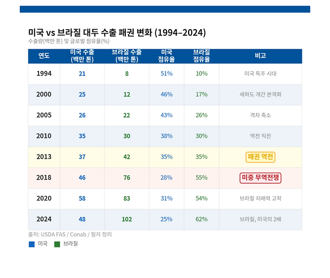 2004년 시카고에 부임했을 때, 미국 중서부를 달리는 곡물 트럭과 열차의 규모는 압도적이었다. 아이오와ㆍ일리노이ㆍ인디애나의 끝없는 대두와 옥수수밭, 그 수확물이 미시시피강 수로를 따라 뉴올리언스 항으로 흘러내려가는 장면은 미국 농업 패권의 상징 그 자체였다. 그때만 해도 세계 대두 수출의 절반이 미국에서 나왔다. 지금은 다르다. 2024년 기준 브라질의 대두 수출량은 미국의 두배에 달한다. 패권이 이동했다.