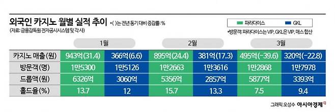 17일 금융감독원 전자공시시스템에 따르면 파라다이스가 운영하는 영업장 4곳(파라다이스시티·워커힐·부산·제주그랜드)의 지난달 카지노 합산 매출은 495억원으로 전년 동기 대비 39.6% 감소했다. 1월과 2월 매출이 지난해 같은 기간보다 각각 31.4%와 24.4% 증가하며 연초부터 호실적을 쌓아 올리다가 제동이 걸린 것이다.GKL이 운영하는 세븐럭 3개 영업장(서울 코엑스·용산·부산)의 지난달 카지노 합산 매출도 전년 동기 대비 22.8% 하락한 320억에 그치면서 6.6%와 17.3% 오름세였던 1~2월에 비해 주춤했다.