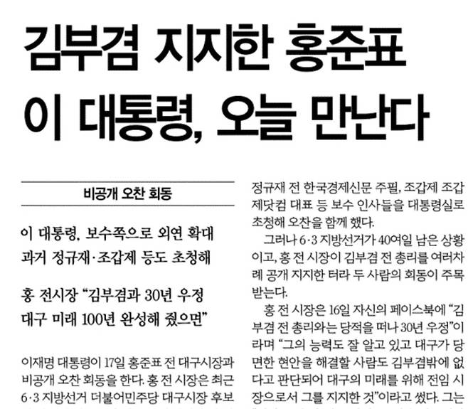 이재명 대통령이 17일 청와대에서 홍준표 전 대구시장과 비공개 오찬을 갖는다. 16일 오후 한겨레 보도 후 홍준표가 페이스북에 인정하는 글을 올리자 거의 모든 언론에 보도됐다.