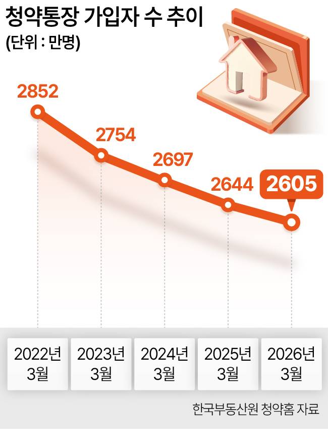 17일 한국부동산원 청약홈에 따르면 3월 말 기준 청약통장(주택청약종합저축·청약저축·청약부금·청약예금) 가입자 수는 2605만1929명이다. 한달 전(2월말 기준, 2608만7504명)에 비해 3만5575명 감소했다. 2643만명대를 기록한 지난해 3월과 비교하면 1년 새 38만156명이 청약통장을 해지한 셈이다.