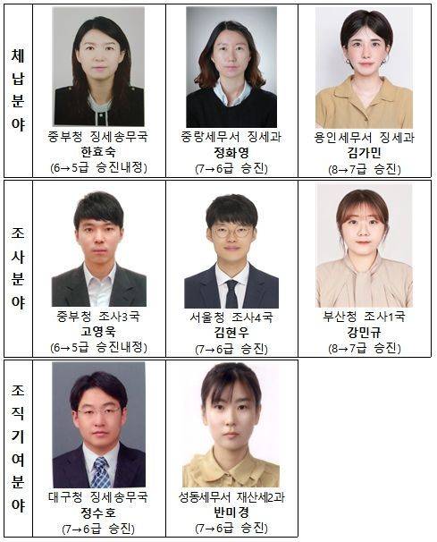승진자 가운데 중부청 징세송무국 한효숙 조사관(5급 승진)은 양도잔금 수백억 원을 자금세탁한 뒤 내연녀 아들 주소지에 숨어 지내던 체납자를 추적했다. 이후 책자 사이에 숨겨둔 무기명 양도성 예금증서를 찾아내 징수했다. 중부청 조사3국 고영욱 조사관(5급 승진)은 제약회사 세무조사에서 임원 비밀금고 내 현금과 은닉된 USB를 찾아냈다. 리베이트 제공의 결정적 증빙자료를 확보하고 비자금을 찾아내 법인세를 추징했다. 대구청 징세송무국 정수호 조사관(6급 승진)은 행정소송 5년 2개월, 민사소송 4년 8개월 동안 단 한 건도 패소하지 않았다. 은닉재산 제보에 관한 최초 소송 승소로 국가예산을 절약했다.