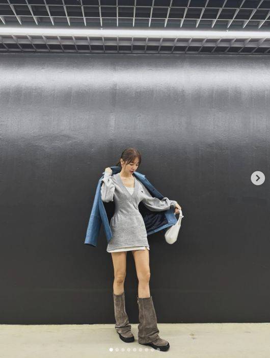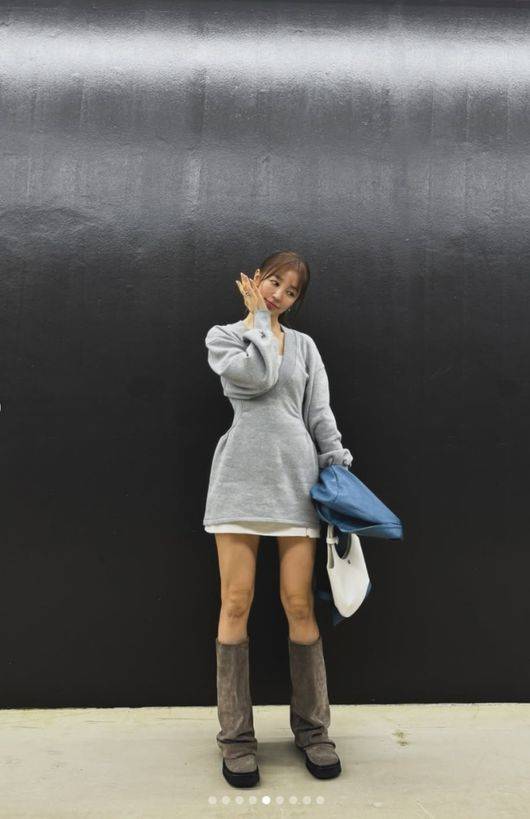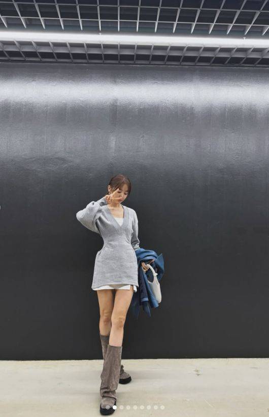 공개된 사진에는 일을 끝낸 뒤 인증 사진을 남기고 있는 윤은혜의 모습이 담겨 있었다. 윤은혜는 회색 니트 소재의 미니 원피스에 부츠를 신고 세련된 패션 감각을 뽐냈다. 짧은 치마로 늘씬한 각선미를 뽐내고, 잘록한 허리 라인을 강조하며 모델핏을 완성했다.