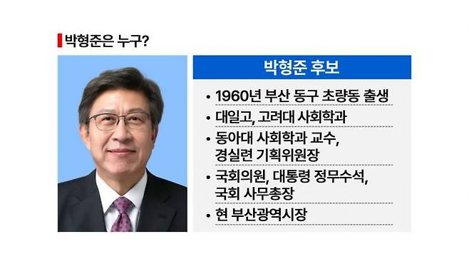 박형준 후보는 부산시장 3선에 도전하고 있다. 2021년 오거돈 전 시장 사태로 치러진 보궐 선거 때 부산시장에 당선했고 2022년에 재선에 성공했다. 1960년 부산 동구 초량동에서 태어났다. 대일고-고려대학교 사회학과를 졸업했다. 동아대 사회학과 교수, 경실련 기획위원장 등을 지내다 2004년 한나라당 국회의원(부산 수영)이 됐다. 이후 대통령 정무수석, 국회 사무총장을 지냈다.