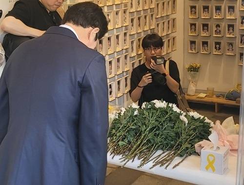 | ▲ 정원오 서울시장 후보 정원오 민주당 서울시장 후보가 14일 오후 2시, 세월호 참사 12주기를 맞아 서울시의회 앞 '기억관'을 찾아 헌화 후, 묵념을 하고 있다. |
