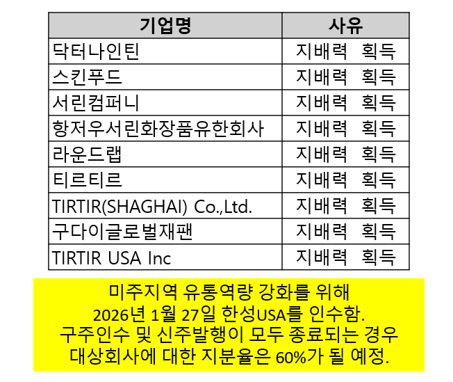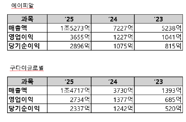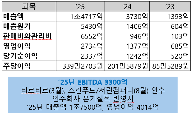매출 성장세가 가파른데요, 2024년 3730억원에서 2025년 1조4717억원으로 급증한 것은 인수합병 효과의 영향이 가장 컸습니다. 구다이글로벌은 지난해 3월 티르티르, 8월에는 스킨푸드와 서린컴퍼니(브랜드명 라운드랩, 대표제품은 자작나무선크림과 독도토너 등)을 인수했습니다.
