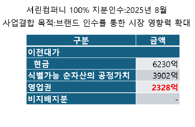 예를 들어 보겠습니다. 지난해 8월 구다이글로벌은 서린컴퍼니 지분 100%를 6230억원에 인수했습니다. 당시 서린컴퍼니의 자산에서 부채를 차감한 순자산(공정가치평가액)은 3902억원이었습니다. 순자산 3902억원 기업을 6230억원을 주고 인수하였으니 말하자면 순자산액 대비 2328억원의 웃돈을 지급한 셈입니다. 이 때의 웃돈을 구다이글로벌은 '영업권'이라는 무형자산 항목으로 연결재무제표에 반영하는 겁니다.