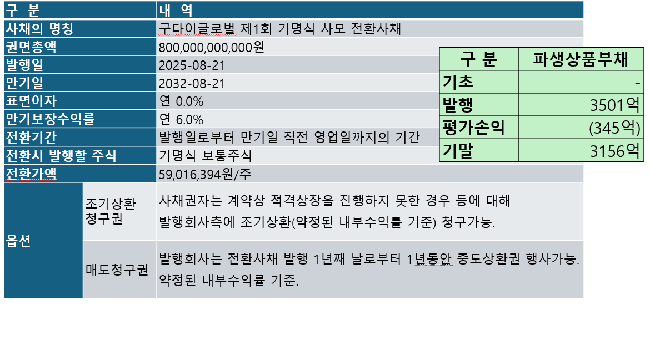 회계처리가 이렇다는 것이고, 구다이글로벌의 경우 CB가 회사에 재무적 부담을 줄 가능성은 거의 없습니다. 지난해 왜 많은 FI들이 이 CB를 서로 인수하겠다며 경쟁적으로 뛰어들었을까요? 구다이글로벌의 IPO를 내다본 겁니다. 기업가치가 올라가고 IPO가 되면 보통주로 전환해 큰 투자차익을 노릴 수 있는 거죠. 구다이글로벌의 CB는 IPO와 함께 부채에서 자본(주식발행)으로 바뀔 것이 확실합니다. 따라서 전환사채 주채무나 파생상품부채는 사라질 것이므로, 현재 부채로 기록되어 있는 장부금액을 그리 신경 쓸 필요는 없어 보입니다.