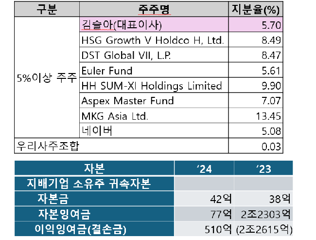현재 김슬아 대표의 지분은 5.70%에 불과합니다. 대다수 재무적투자자들보다 지분율이 낮습니다. 사업상 제휴를 맺은 네이버(5.08%)와도 지분율이 비슷한 수준이죠. 회사 성장과정에서 외부의 지분투자를 많이 받았기 때문에 저렇게 창업자 지분에 과도한 희석이 발생한 겁니다.