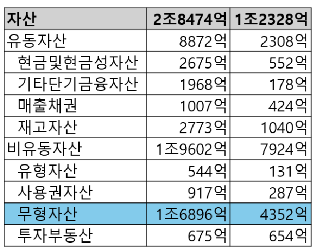 재무상태표의 자산항목을 보겠습니다. 2024년 1조2328억원이던 자산이 2025년 2조8474억원으로, 1년새 2.3배나 증가했습니다. 무형자산이 4352억원에서 1조6896억원으로, 4배 가까이 급증한 것이 눈에 띄는데요, 다수의 M&A를 하면서 인식하게 된 영업권 등의 영향으로 보입니다.