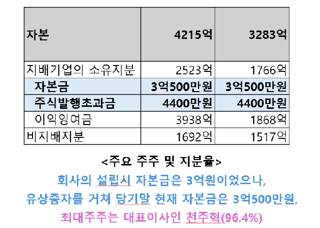 매출이 1조5000억원에 달하는 회사로 성장하였는데, 자본금은 여전히 3억500만원에 불과합니다. 심지어 주식발행초과금(자본잉여금)은 1억원도 안되는 4400만원에 불과합니다. 창업자인 천주혁 대표가 회사를 키우면서 외부의 지분투자를 거의 안 받았다는 이야기입니다. 앞에서 봤듯 M&A 자금도 나중에 주식전환은 하겠지만 일단은 CB로 조달했습니다. 그래서 현재 천 대표의 지분율은 여전히 96.4%에 이릅니다. 흔치않은 사례인 것 같습니다.