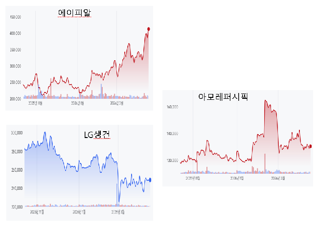 에이피알이 국내 대형 화장품 회사 시총을 앞지르기 시작했다는 보도를 본 게 엊그제같은 느낌인데요, 이제는 거의 넘사벽이 돼가고 있습니다. 아모레퍼시픽 시총은 7조7900억원, LG생활건강은 3조87800억원 수준입니다.