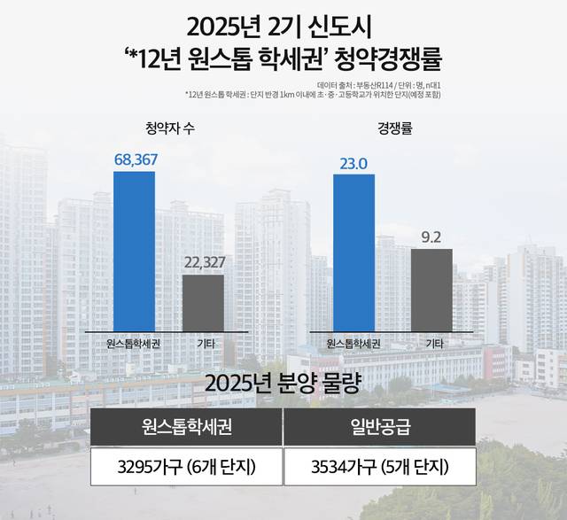 17일 부동산인포가 부동산R114 자료를 분석한 내용에 따르면, 지난해 수도권 2기 신도시에 분양한 11개 단지 가운데 반경 1km 안에 초·중·고등학교(예정 포함)가 모두 갖춰진 ‘원스톱 학세권’ 단지 6곳은 청약자 6만8367명을 모았다. 같은 기간 2기 신도시 전체 청약자(8만2510명)의 82%에 달한다.