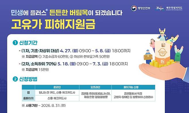 지원금 온라인 신청은 탐나는전 앱이나 카드사 앱·누리집을 통해 가능하다. 현장 방문 신청은 읍면동 주민센터나 카드사 제휴 은행 영업점에서 가능하다.