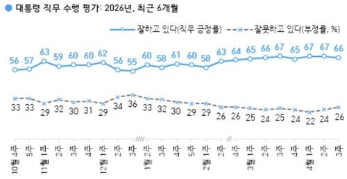 이재명 대통령 국정 지지율이 66%를 기록했다는 여론조사 결과가 17일 나왔다.