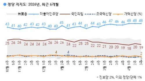 조국혁신당, 진보당, 개혁신당은 각각 2%를 기록했으며 지지하는 정당 없는 무당(無黨)층은 26%다.