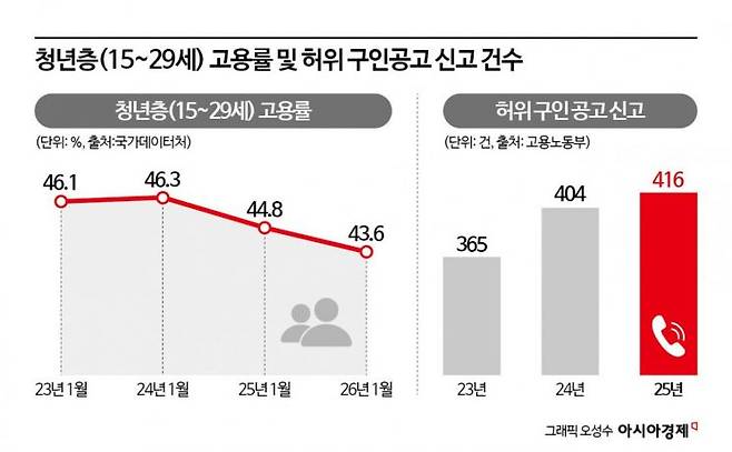 17일 고용노동부에 따르면 '거짓 구인공고' 관련 신고는 2023년 365건, 2024년 404건, 2025년 416건으로 늘고 있다. 올해 1분기(1~3월) 청년 실업률은 7.4%로, 2021년 이후 가장 높았다. 취업난은 해소되지 않고 있지만, 구직자를 기만하는 거짓 구인공고는 늘어나고 있는 것이다.