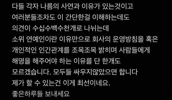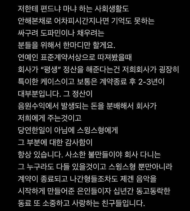 그러면서 그는 "누구나 회사에 다니며 사소한 불만은 있을 것이다. 스위스형뿐만 아니라 계약이 종료되고 나간 형들도 모두 은인, 동료, 소중하고 사랑하는 친구들"이라고 전했다. 끝으로 그는 "소위 연예인이란 이유만으로 회사의 운영 방침 혹은 개인적인 인간관계를 조목조목 밝히며 해명해야 하는 이유를 단 한 개도 모르겠다. 모두 싸우지 않았으면 한다"며 대중의 과몰입에 대해 불편함을 내비쳤다.