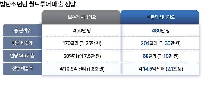 낙관적 시나리오로 보면 방탄소년단이 월드투어로 끌어모을 누적 관객 수는 총 480만명. 평균 티켓 가격은 204달러(약 30만원), 1인당 MD(굿즈 등 기획 상품) 소비액은 68달러(10만원) 등으로 추정돼 약 14억5000만달러(약 2조1400억원)의 수익을 낼 것으로 분석됐다. 보수적 시나리오로 봐도 관객 약 450만명, 평균 티켓가격 170달러(25만원), 1인당 MD 소비액 50달러(약 7만5000원) 등 총 10억9000만달러(1조6000억원)의 수익을 낼 것으로 보인다. 이에 예상되는 근접치는 13억6000만달러(약 2조원)가량이다.