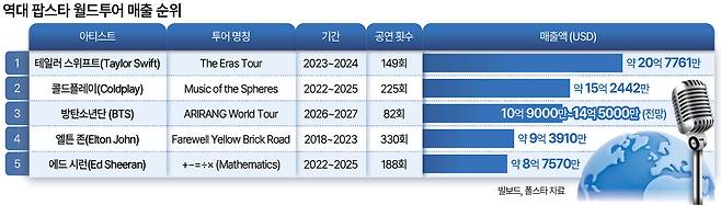 투어를 마치면 방탄소년단은 단숨에 글로벌 아티스트 역대 월드투어 매출 순위 톱3에도 이름을 올리게 된다. 방탄소년단 앞엔 ‘부동의 1위’인 팝스타 테일러 스위프트(약 20억7761만달러), 콜드플레이(약 15억2442만달러) 둘 뿐이다.