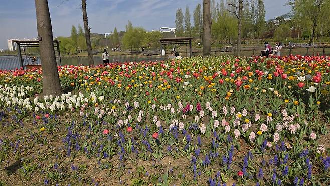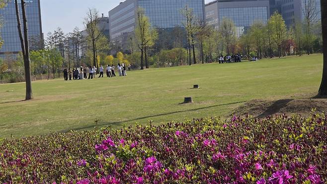 | ▲ 서울식물원 잔디마당 봄꽃이 만발한 잔디마당에서 젊은이들이 활기차게 시간을 보내고 있다. |