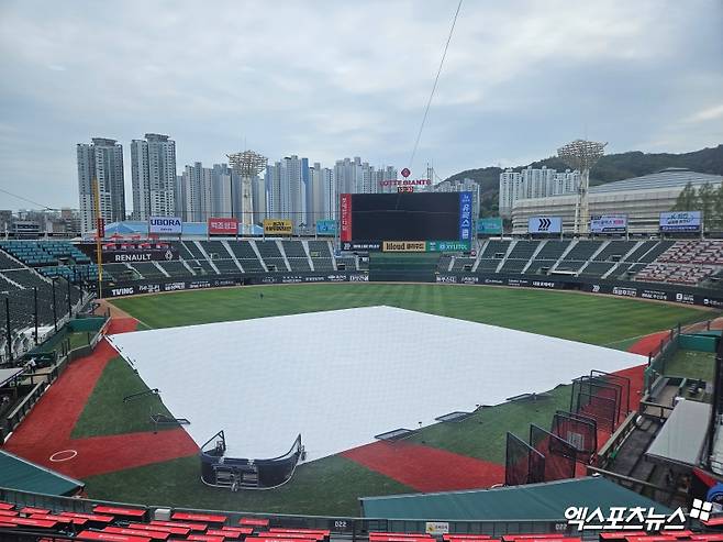 사직구장 대형 방수포 깔렸다→'오후 4시부터 비 예보'→'시선집중' 한화-롯데 1차전 정상 가능할까 [부산 현장]