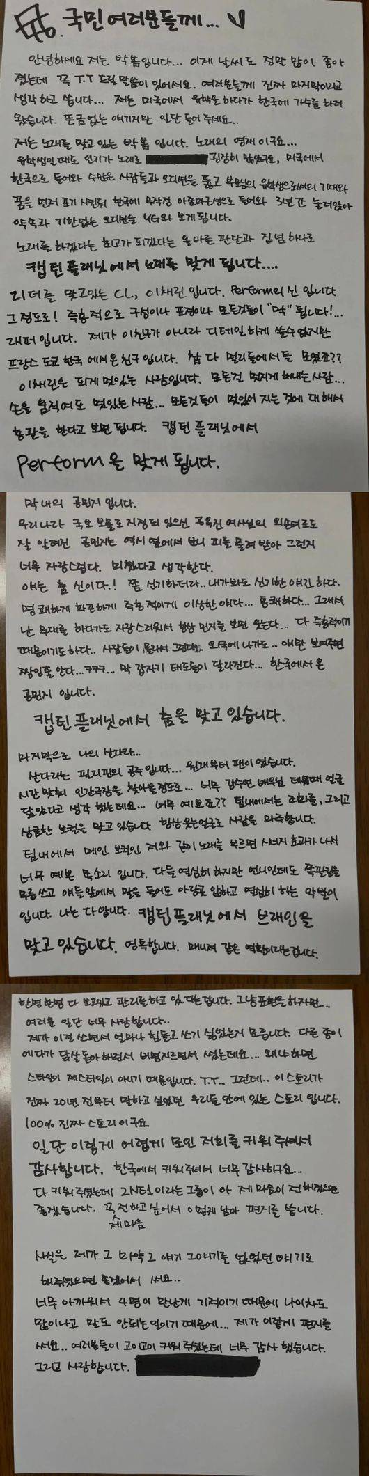 사실은 제가 그 마약 그 얘기 그거를 없었던 얘기고 해주셨으면 좋겠어서 써요… 너무 아까워서 4명이 만난게 기적이기 때문에 나이차도 많이나고 말도 안되는 일이기 때문에… 제가 이렇게 편지를 써요.. 여러분들이 고이 키워 주셨는데 너무 감사 했습니다.