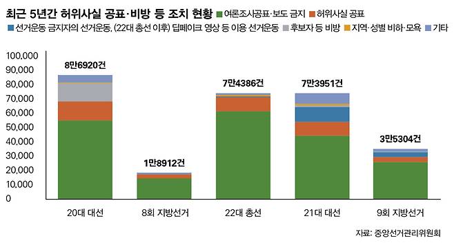 실제 6·3 지방선거를 40여 일 앞두고 여론 왜곡·조작 행태는 빠르게 확산하고 있다. 중앙선거관리위원회를 통해 입수한 자료에 따르면, 적발된 허위사실공표 및 비방 등의 불법 게시물은 4월1일을 기준으로 무려 3만5304건에 달했다. 지방선거로만 보면, 직전 선거였던 2022년 지방선거(1만8912건) 때보다 약 2배 늘어났다. 선관위는 3만여 건의 허위 게시물 대부분에 대해 삭제 조치를 내렸다. 고발한 사건은 8건, 수사 의뢰는 1건, 경고 조치는 50건으로 나타났다.
