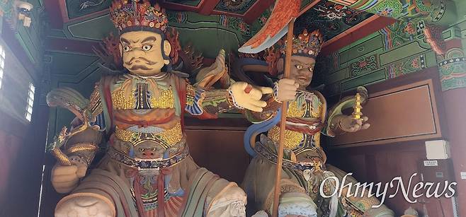 일주문을 거쳐 금강문을 통과하니 천왕전에 있는 사천왕상이 보인다. 눈을 부릅뜬 사천왕. 왜 이렇게 무서운 표정을 짓는 것일까. 다시 휴대폰을 여니 '분노와 위엄으로 악귀·잡귀·사악한 요소를 제압하는 수호신의 역할을 상징하기 때문'이라는 설명이 검색된다.