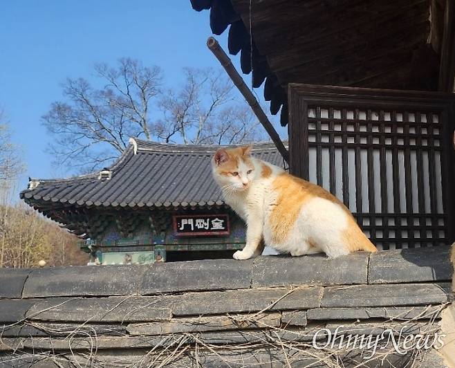 전라북도 완주에 있는 '송광사'라는 작은 절에 도착한 것은 지난 11일 오전. 스님이 아닌 고양이의 마중을 받으며 절에 발을 들이자 너른 마당이 있는 시원한 절 풍광이 한눈에 들어왔다. 절 담장에 살포시 앉아 있는 고양이. 다가가 사진을 찍는데도 도망치지 않는 것을 보니, 사람의 보살핌을 받는 고양이인 게 분명해 보인다.