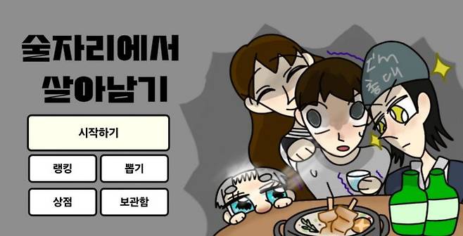김여준·조세리 학생이 개발한 '술자리에서 살아남기(Surviving a Drinking Party)'는 게임잼에서 도출된 아이디어를 바탕으로 완성도를 높인 작품이다. '술빼기 버튼'을 활용해 취함 게이지를 조절하는 방식과 다양한 선택지, 미니게임 요소를 결합한 전략형 플레이가 특징이다.