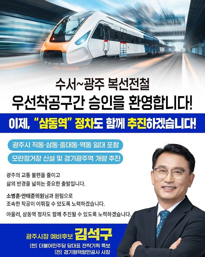 김석구 더불어민주당 광주시장 예비후보가 수서~광주 복선전철(수광선) 우선착공구간 실시계획 승인에 환영 입장을 밝히며, 노선 내 삼동역 정차 필요성을 제기했다.