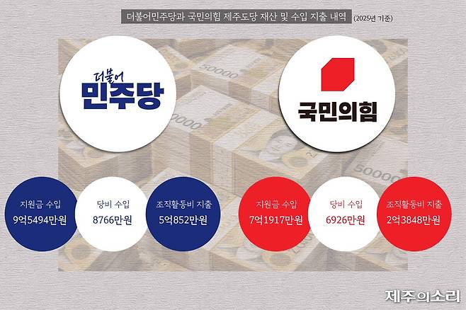 제주에서 합산 당원 12만명 시대를 연 더불어민주당과 국민의힘이 각종 수입을 양분하면서 정당 간 빈부 격차도 심화되는 것으로 나타났다.