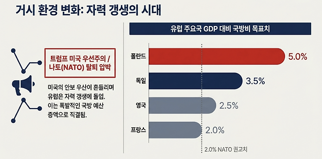 한국-폴란드 정상회담의 의미를 이해하려면 우크라이나 전쟁 이후 유럽의 분위기를 살펴보야 한다. 우크라이나 전쟁 이후 유럽 각국은 국방비를 빠르게 늘리고 있다. 그동안 나토 회원국의 안보 무임승차를 비판해 왔던 미국의 압박도 있었고 전쟁이 유럽 대륙 가까이에서 벌어지자 각국은 더 이상 안보를 미룰 수 없는 과제로 보기 시작했다. 대부분 유럽 국가들은 GDP 대비 국방비 비중을 3% 이상으로 높이기로 했고, 특히 전쟁중인 우크라이나에 인접한 폴란드는 5%까지 끌어 올리겠다는 공격적인 방침을 세웠다.