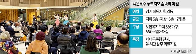 17일 오전 출근 시간대에 서울 강남에서 20분 만에 도착한 경기 의왕 ‘백운호수 푸르지오 숲속의 아침’. 이곳 커뮤니티 센터에선 당구 경기가 한창이었다. 입주민으로 구성된 당구 동아리 회원 사이에서 웃음이 끊이지 않았다. 바로 옆 기원에선 바둑 경기가, 음악당에선 통기타 수업이 이뤄지고 있었다. 자녀와 부모가 도서관에 앉아 함께 신문을 읽는 풍경도 이곳에선 낯설지 않다. 디벨로퍼(부동산개발) 그룹 엠디엠이 조성해 운영하는 시니어 주거타운의 모습이다.