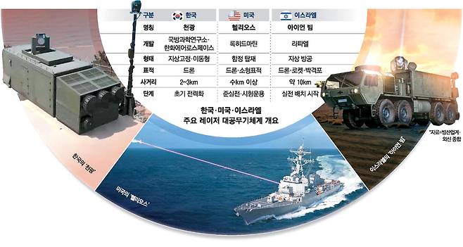 각국은 '맞으면 손해고 막을수록 더 밑지는' 방공전의 딜레마를 극복하기 위해 레이저 대공무기에 눈을 돌리고 있다. 아직은 개발·시범운용 단계가 많지만 한 발 쏘는 데 드는 비용은 많아야 10달러(약 1만5000원)다. 공격·방어 교환비를 단번에 뒤집을 수 있는 '무한탄창'의 게임 체인저가 되는 셈이다. 17일 군 소식통은 "한국의 레이저 무기체계 관련 역량은 세계 7위권으로 평가된다"면서 "1위는 미국, 2위는 이스라엘인데 3~7위 사이에는 기술 수준 차이가 크지 않다"고 말했다. 이어 "한국도 이미 레이저 무기체계를 시험 도입했고 성능을 높이기 위한 개발작업을 진행 중"이라고 설명했다.
