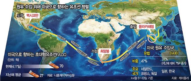 미국산 원유의 아시아 수출은 80% 이상 급증했고 아프리카 최남단 희망봉을 돌아 미국 멕시코만까지 편도로만 60일이 걸리는 바닷길은 아시아 유조선들로 장사진을 치고 있다.
