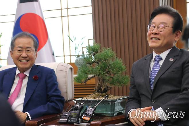 | ▲ 2023년 5월 당시 이재명 더불어민주당 대표와 홍준표 대구시장이 대구시청 산격청사에서 만나 대화를 나누는 모습. |