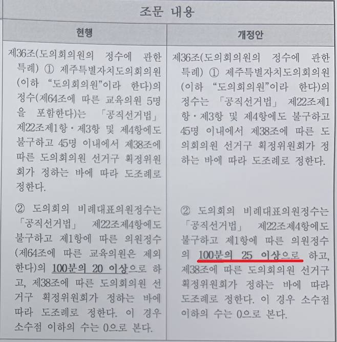 한편, 제주특별자치도는 지난해 10월 교육의원(5명) 폐지 대신 도의원 증원이 가능하지 행정안전부와 법제처에 유권해석을 의뢰했지만, 제주의 인구가 정체됐고 지리적·환경적 요인을 검토할 때 증원 사유가 없다는 답변을 받았다.
