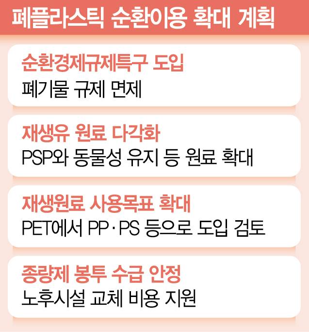 이 외에 정부는 생수병에 사용되는 폴리에틸렌테레프탈레이트(PET)뿐 아니라 불투명한 배달 용기인 폴리프로필렌(PP), 세제통으로 사용되는 폴리에틸렌(PE)에 대해서도 재생 원료 의무 사용 비율 도입을 검토하기로 했다. 현재 PET에 대해서는 10%의 재생원료 사용 목표치가 설정됐는데 생활가전과 화장품 용기 등으로 사용되는 PP와 PE 등에 대해서도 재생 원료 사용 의무를 부과하기로 했다. 이와 관련해 정부 관계자는 “유럽연합(EU) 등 선진국 동향과 관련 기술 성숙도 등을 고려해 도입 시기와 목표율 등을 검토하겠다”고 설명했다.