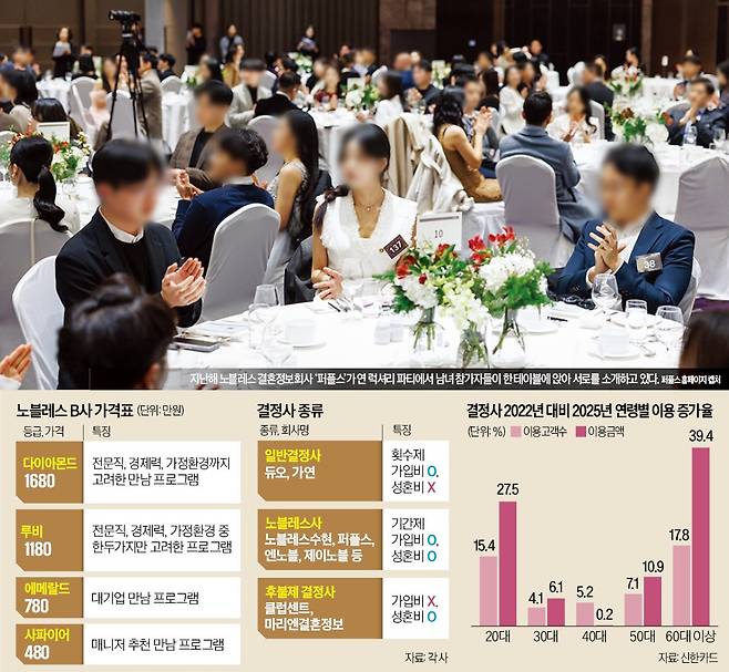부모가 비용을 대신 부담하는 사례도 늘고 있다. 신한카드가 초혼 중심 8개 결혼정보회사의 결제 데이터를 분석한 결과 2025년 60대 이용 금액이 2022년 대비 39.4% 증가했다.