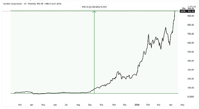 시장 전체와 함께 하락하는 대신, 이 주식은 전쟁 시작 이후 50% 넘게 급등했고 지난 1년 기준으로는 2,500% 이상 상승했다. 얼핏 보면 직관에 어긋나는 흐름처럼 보일 수 있다. 하지만 조금만 더 들여다보면, 샌디스크를 움직이는 힘이 시장 전체를 좌우하는 그것과는 다르다는 점이 분명해진다.