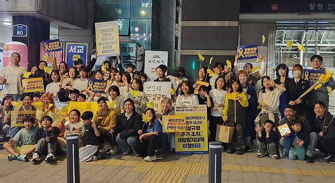| ▲ 16일 밤 서울 마포구 망원역에서 성미산학교 학생을 비롯한 성미산마을 사람들이 세월호 참사 12주기 집중 선전전을 마무리한 뒤 기념사진을 촬영하고 있다. |