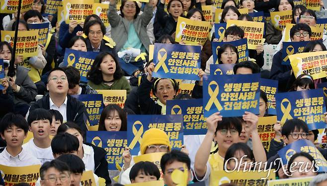 | ▲ 세월호 참사 유가족과 시민들이 11일 오후 서울 중구 시청역 앞에서 열린 4.16 세월호 참사 12주기 기억·약속 시민대회에 참석해 세월호 참사를 추모하며 진실 규명과 생명안전 사회를 촉구하고 있다. |